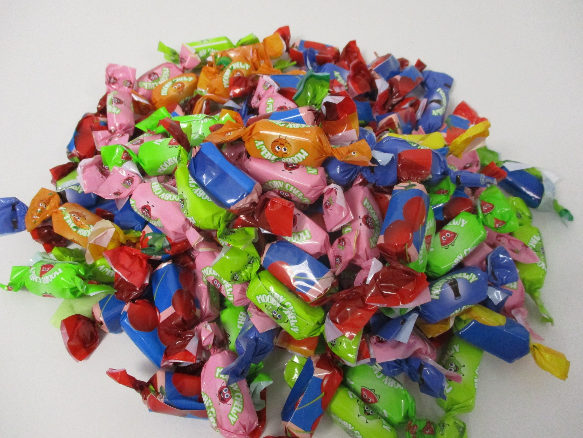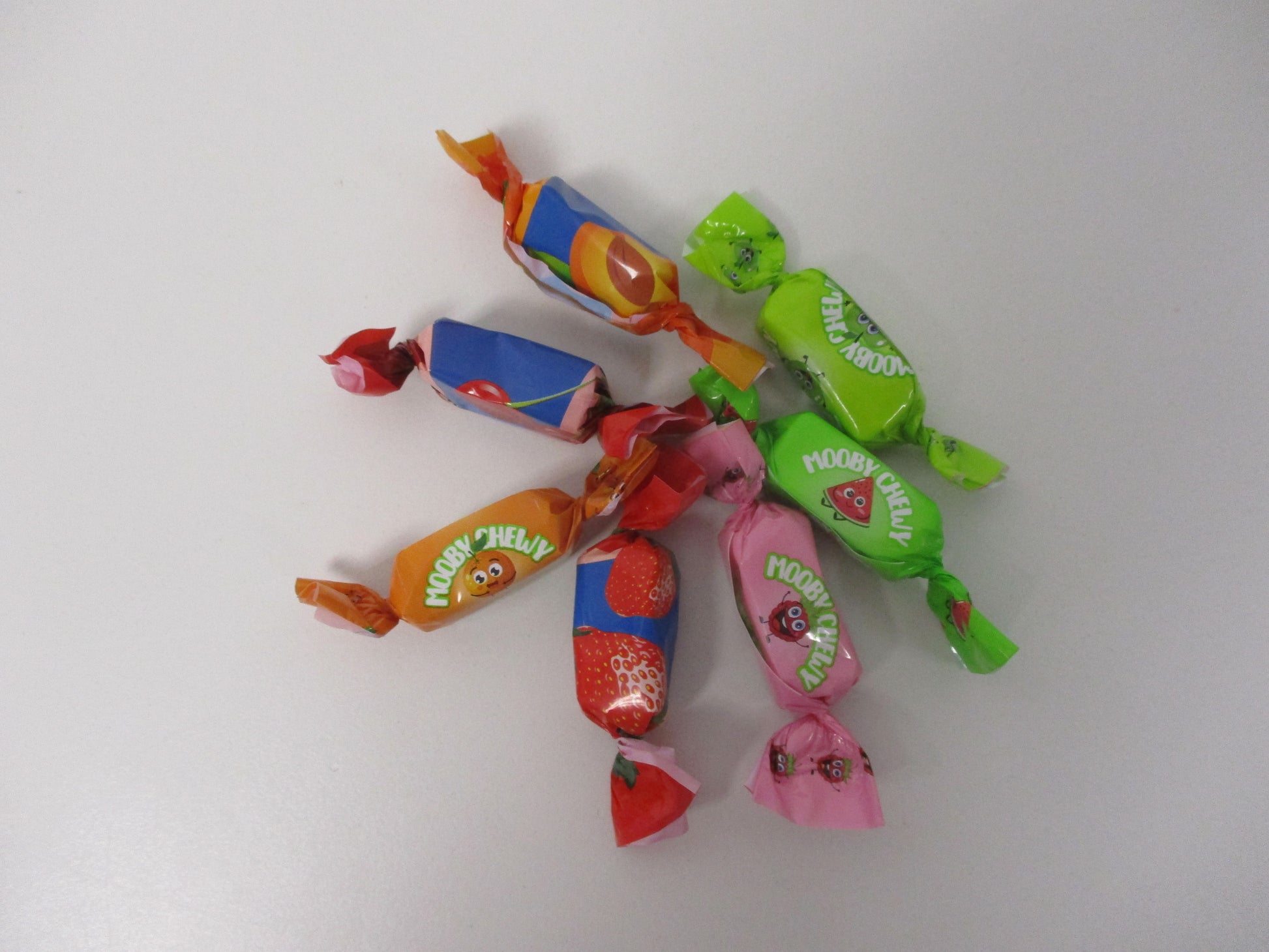 Kaubonbons in den Geschmacksrichtungen Erdbeere, Orange, Kirsche, Zitrone und Apfel