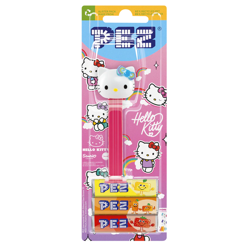 Jeder PEZ Spender enthält drei PEZ-Bonbons-Nachfüller a'8,5g mit Fruchtgeschmack (Zitrone, Orange, Erdbeere).