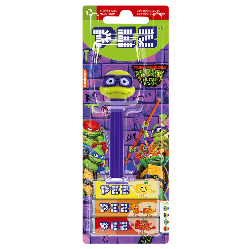Jeder PEZ Spender enthält drei PEZ-Bonbons-Nachfüller a'8,5g mit Fruchtgeschmack (Zitrone, Orange, Erdbeere).
