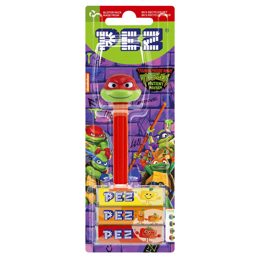 Jeder PEZ Spender enthält drei PEZ-Bonbons-Nachfüller a'8,5g mit Fruchtgeschmack (Zitrone, Orange, Erdbeere).